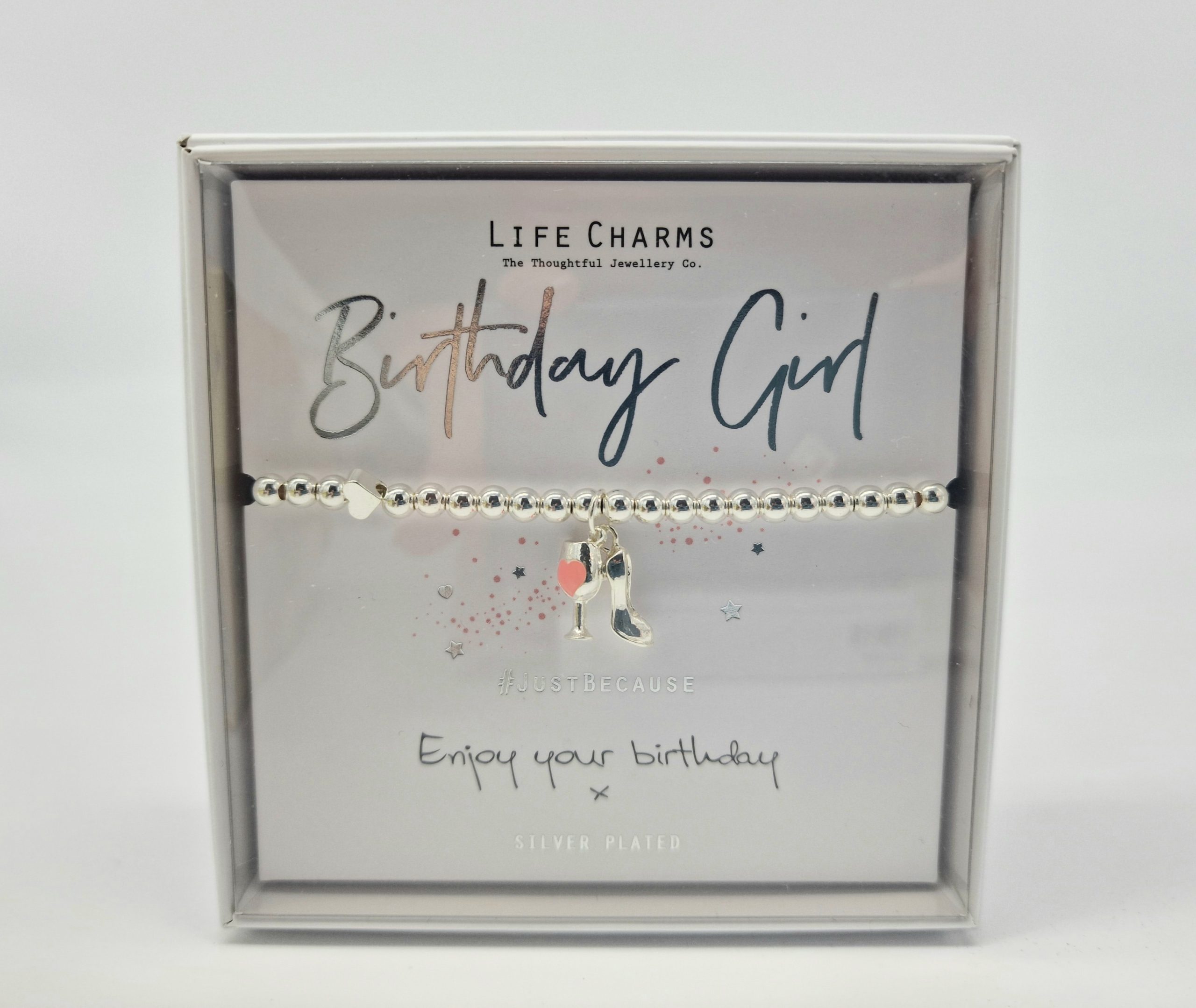 - Pure silver plated bracelet with charms, on 5mm beaded stretch bracelet. The bracelet comes presented in a luxury gift box, with a Just Because ‘Enjoy your Birthday’ card. All jewellery is finished to the highest standard & E-coated to prevent any tarnishing.