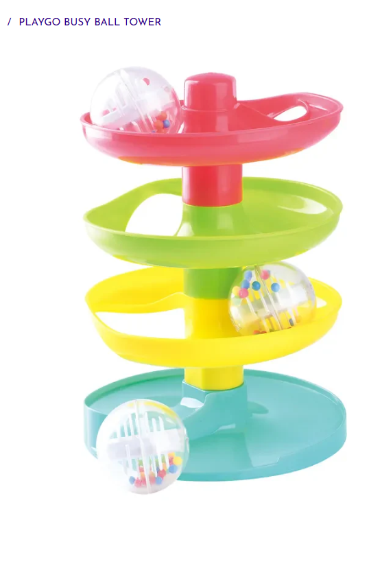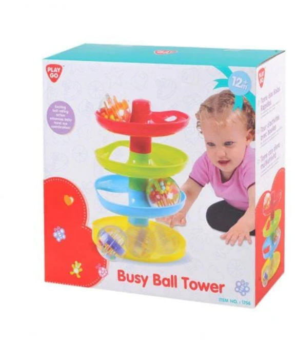 This Busy Ball Tower features sturdy construction and colourful levels that see-through balls spin and swirl through. This 4-tier, multi-coloured ball ramp includes three spinning activity balls, the perfect kids toys. Tower easily breaks down for on-the-go activities and can be built in a snap. Acrylic balls contain colourful beads that make fun noises when rolled.